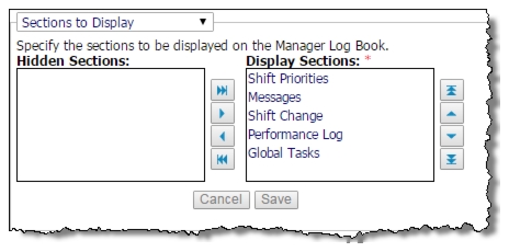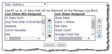 Determines the sections and statistics that appear on the Manager Log Book screen. All sections appear by default, and you must specifically remove them if you do not wish for them to appear. First, select ‘Sections to Display’ to determine the sections to appear and configure the controls for that section. Note: The Line items section and the Weather, Reminders, and Daily Specials sections always appear at the top of your Manager Log Book welcome screen and cannot be rearranged. Select ‘Daily Statistics’ to define the line items that appear in the Line Items section of the Manager Log Book. By default, all sections appear. If you elect to not display all sections, you must select at least one section to appear on the Manager Log Book.