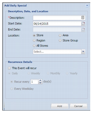 2. Click Add, or click the double-left-arrow in the top right corner of the calendar, to expand the Add Daily Special screen.